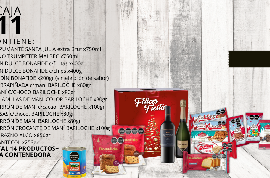Espumante Santa Julia extra brut 750ml x 1u, Vino Trumpeter Malbec 750ml x 1u, Pan Dulce Bonafide con frutas 400g x 1u, Pan Dulce Bonafide con chips 400g x 1u, Budin Bonafide 200g (sin eleccion de sabor) x 1u, garrapiñada con mani Bariloche 80g x 1u, Mani con chocolate bariloche 80g x 1u, Peladillas de mani color Bariloche 100g x 1u, Pasas con chocolate Barioche 80g x 1u, Turron de mani Bariloche 80g x 1u, Turron crocante de mani Bariloche 100g x 1u, Durazno Alco 850g x 1u, Mantecol 253g x 1u (Total 14 productos + caja contenedora)